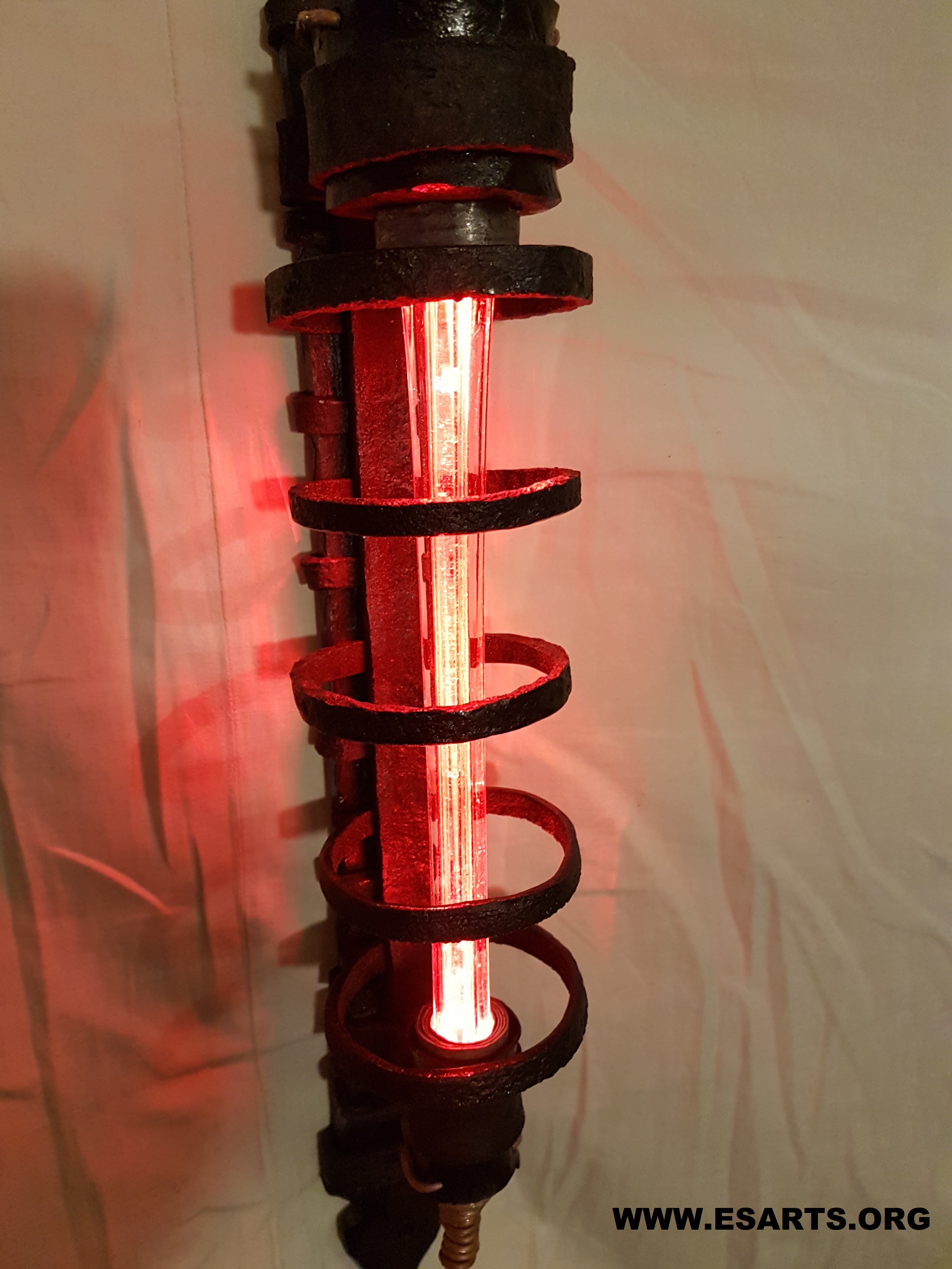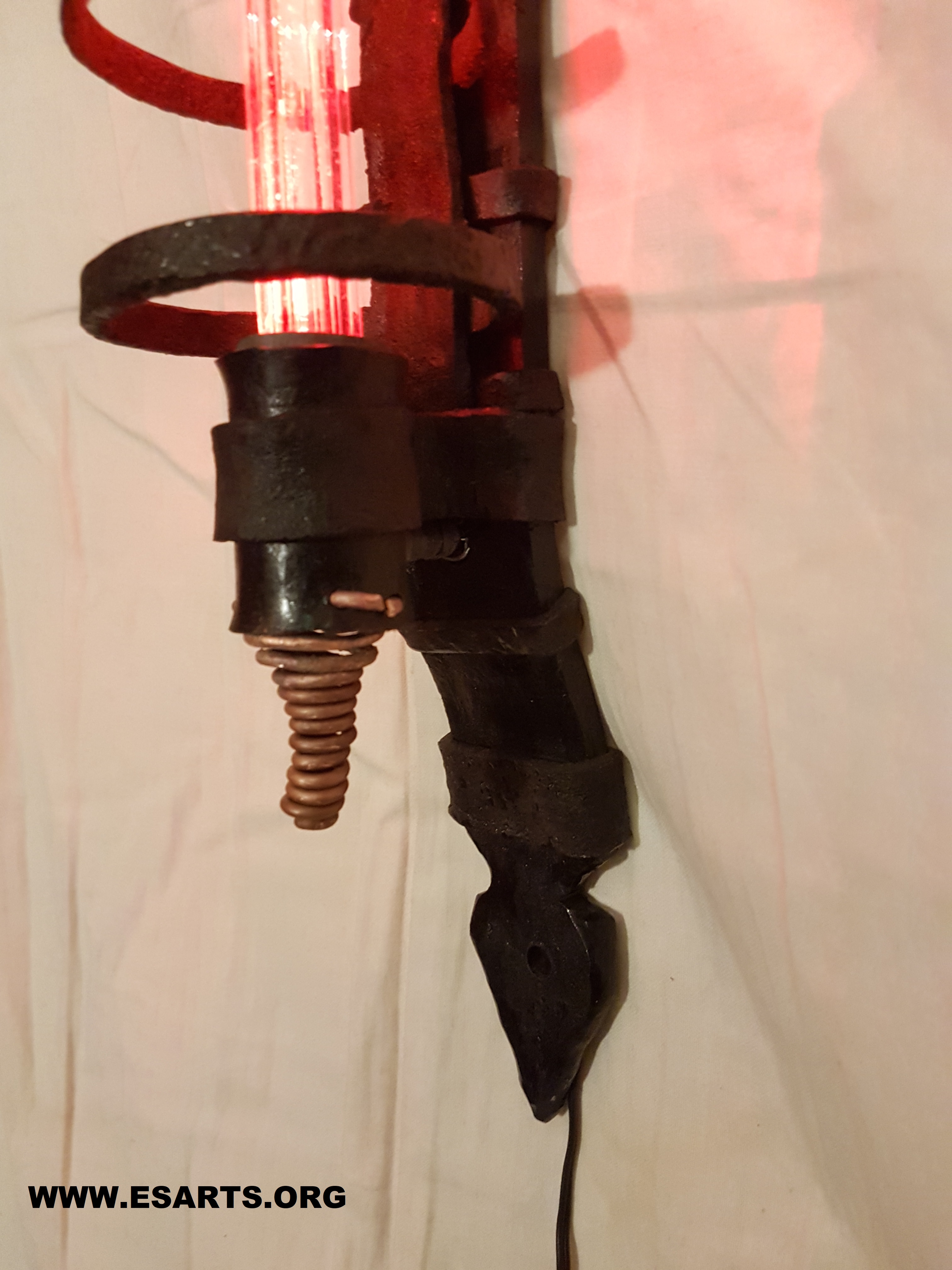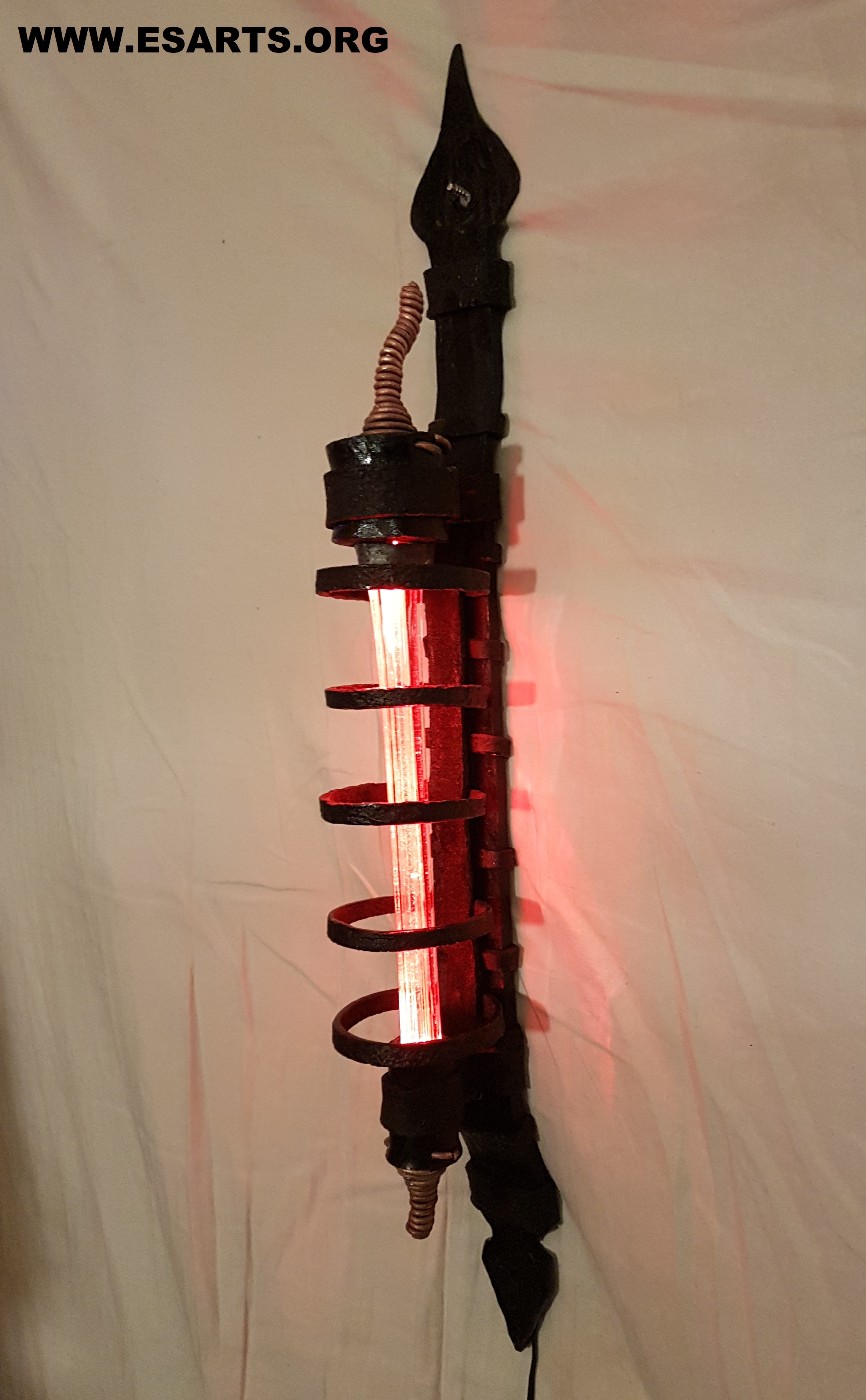 RECTRON. 2022 Sculpture made of iron from an over 100 year old watermill ruin outside the city of Eksjö. the iron has clear traces of hammer blows from the blacksmiths who once worked on it! The iron has then been out in the woods for a long time and has corroded so that it now has a beautiful organic look! A leaded glass rod in the middle glows with a red light and Details of twisted copper wire decorates the ends of the light source. The Sculpture is 60 cm high.