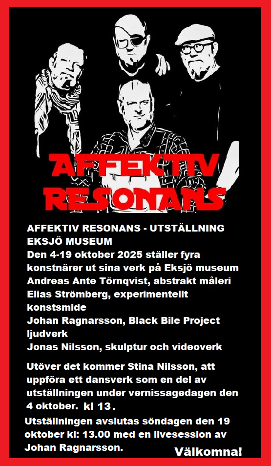 AFFECTIVE RESONANCE – EXHIBITION EKSJÖ MUSEUM On October 4-19, 2025, four artists will exhibit their works at Eksjö Museum Andreas Ante Törnqvist, abstract painting Elias Strömberg, Experimental metal works Johan Ragnarsson, Black Bile Project sound work Jonas Nilsson, sculpture and video work In addition, Stina Nilsson will perform a dance piece as part of the… Fortsätt läsa AFFECTIVE RESONANCE
