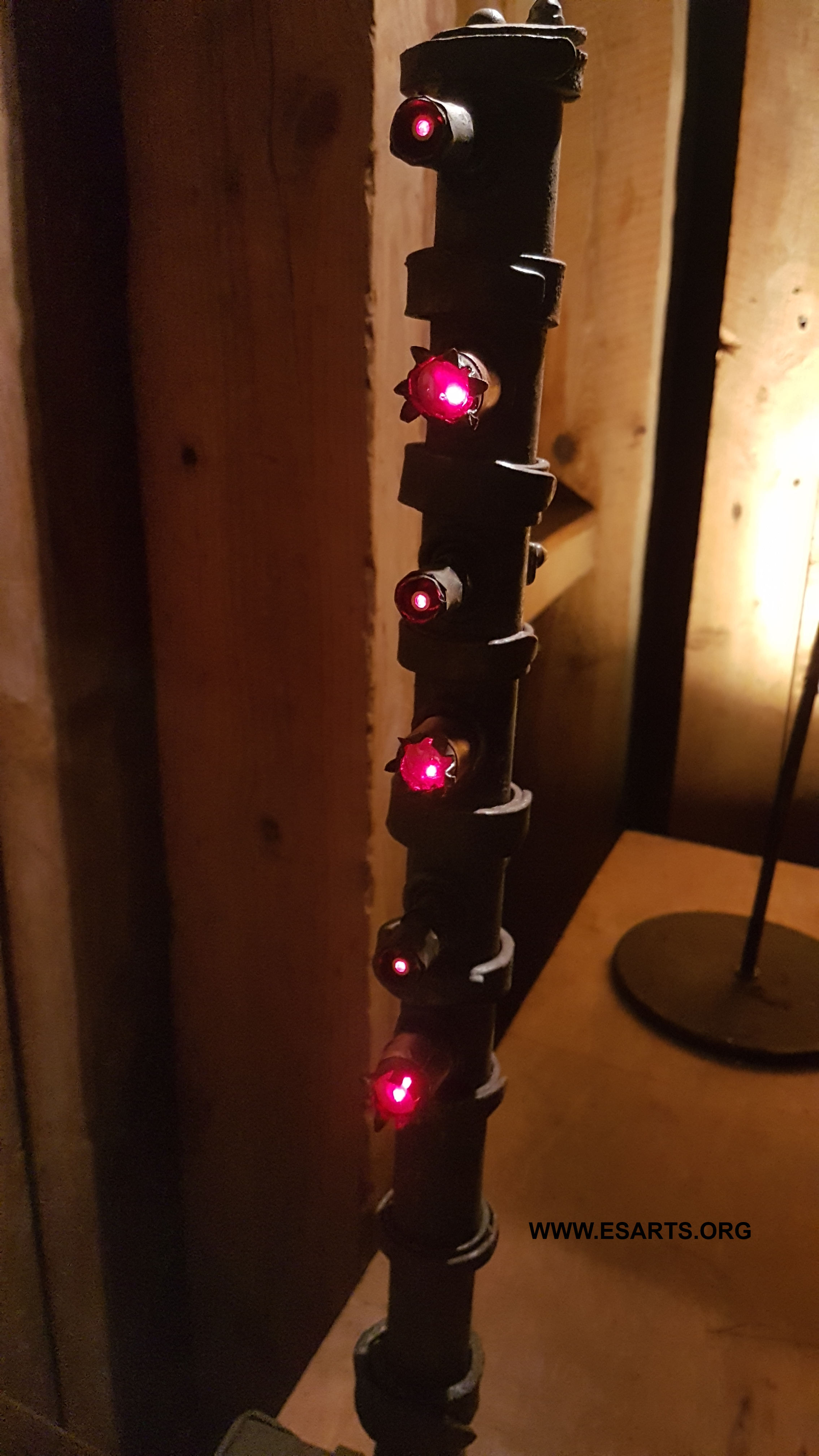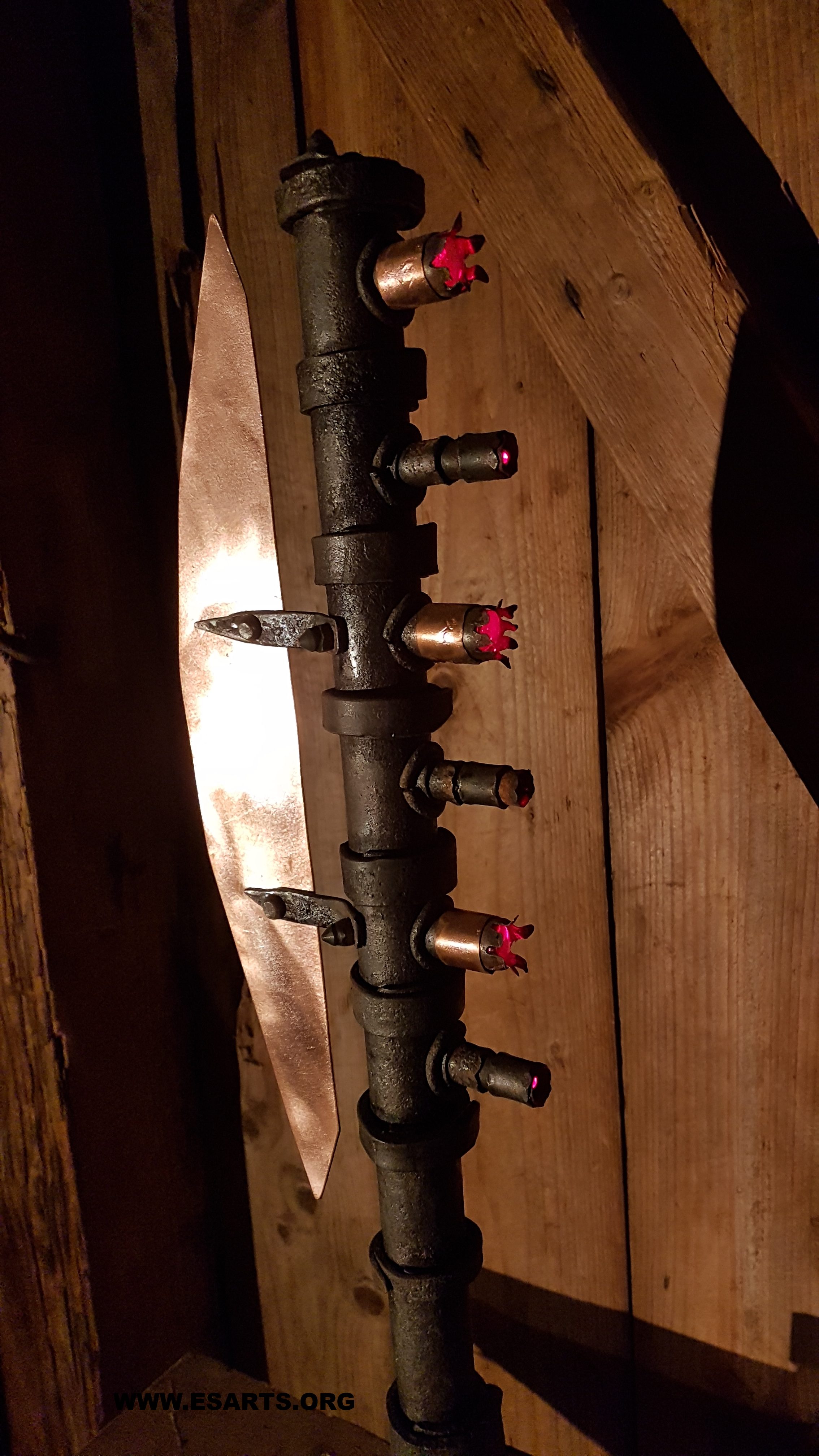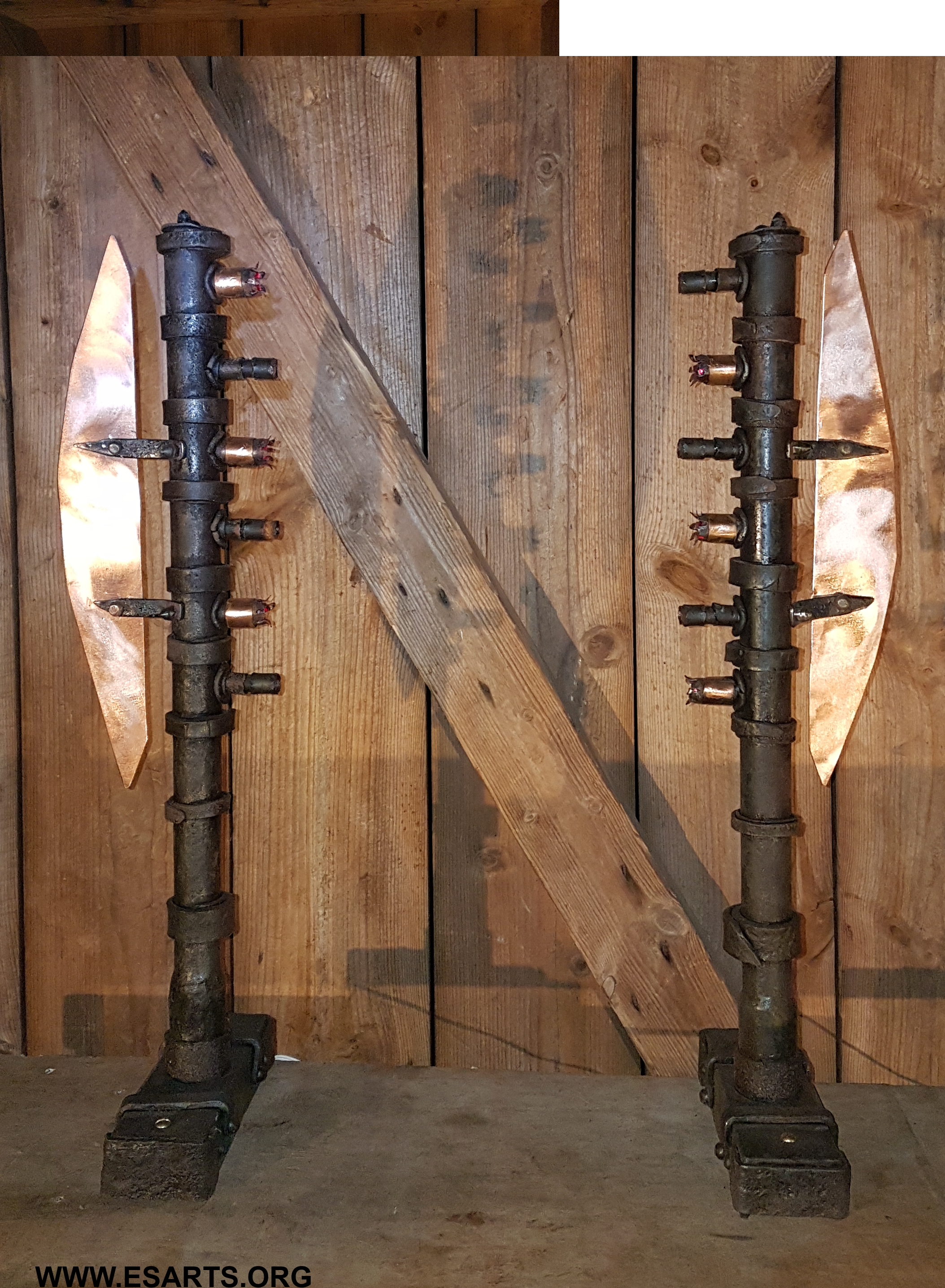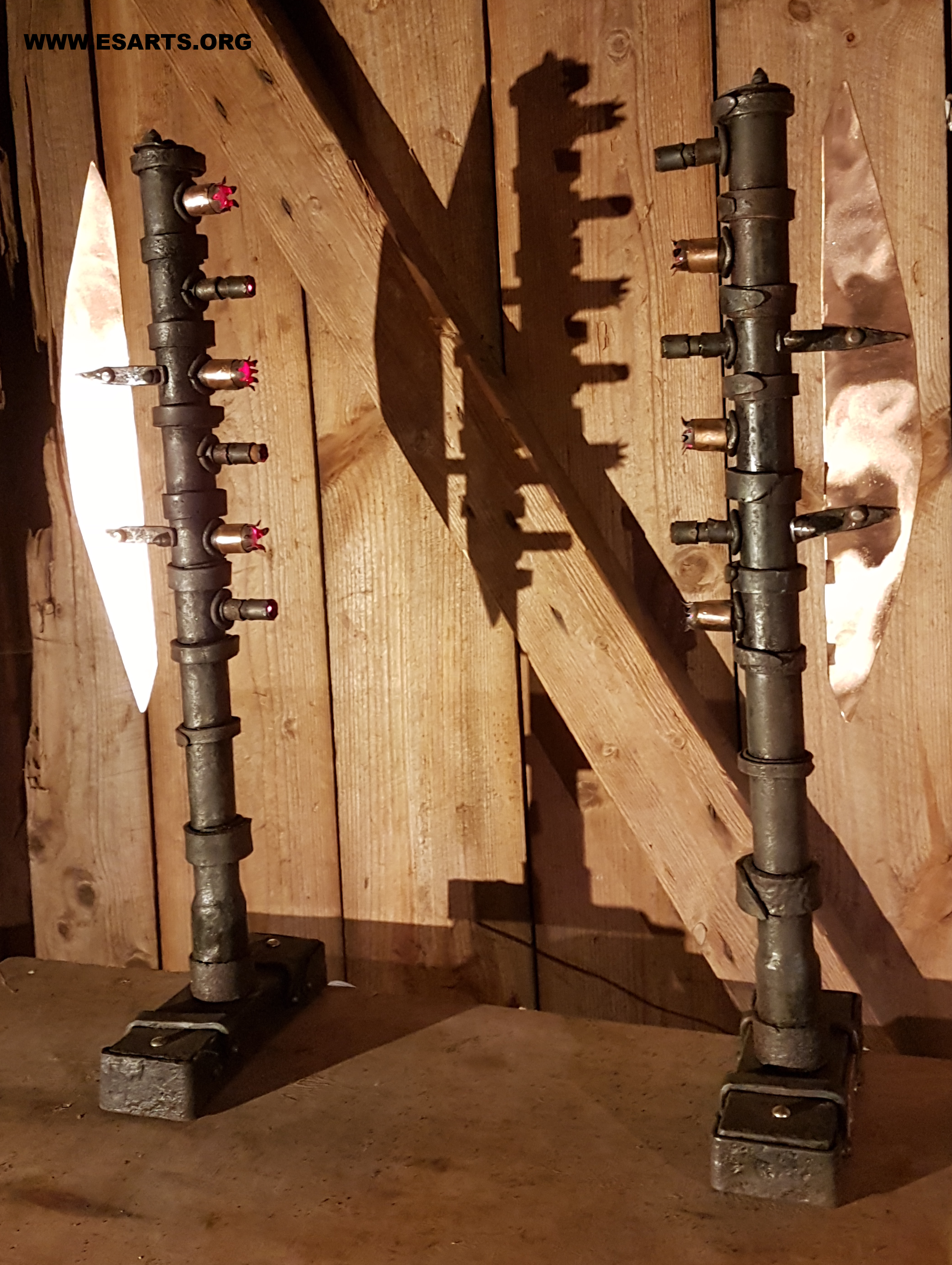 Communicators ,2025. iron and copper. The sculpture consistng of two units that stand opposite each other and illuminate each other’s glas lenses, three each with red flickering laser beams as a kind of optical communication effect.
